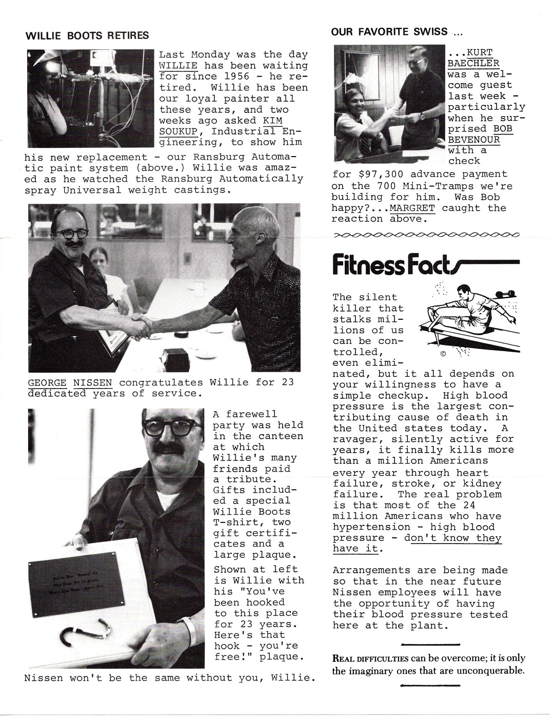 1979 (May) Nissen Employee Fitness Center (in Nissen Gym) Opens 3/14 ~ Nissen Men's Softball Team Scores a Win ~ Nissen Men's Bowling Team 3rd in League ~ Chuck Coker Visits Nissen-Universal~ Munn & Schultschick Visit Egypt